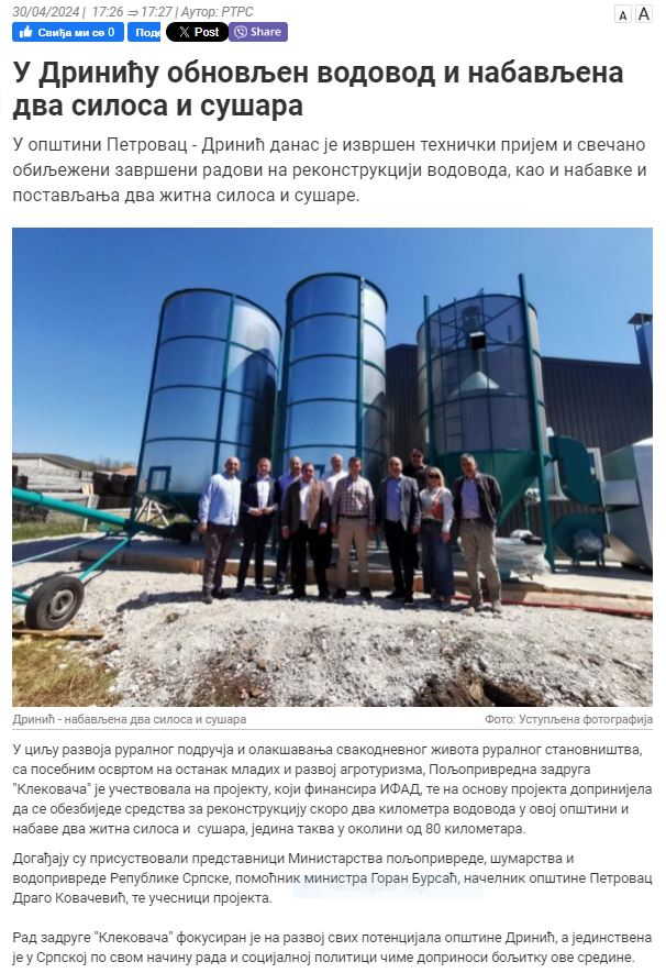 Poljoprivredna zadruga “Кlekovača” je učestvovala na projektu, koji finansira IFAD, te na osnovu projekta doprinijela da se obezbijede sredstva za rekonstrukciju skoro dva kilometra vodovoda